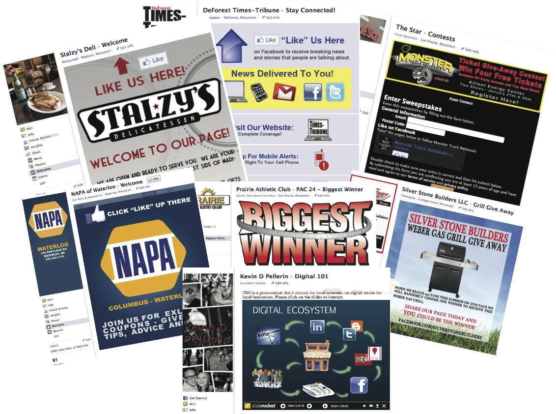 Here is a sampling of some of the Facebook tabs that I have created. I use Facebook and third party applications to create “Like” gating, contest, iframe, presentation, video and sweepstakes tabs. I am also the current administrator of over 25 Facebook pages.